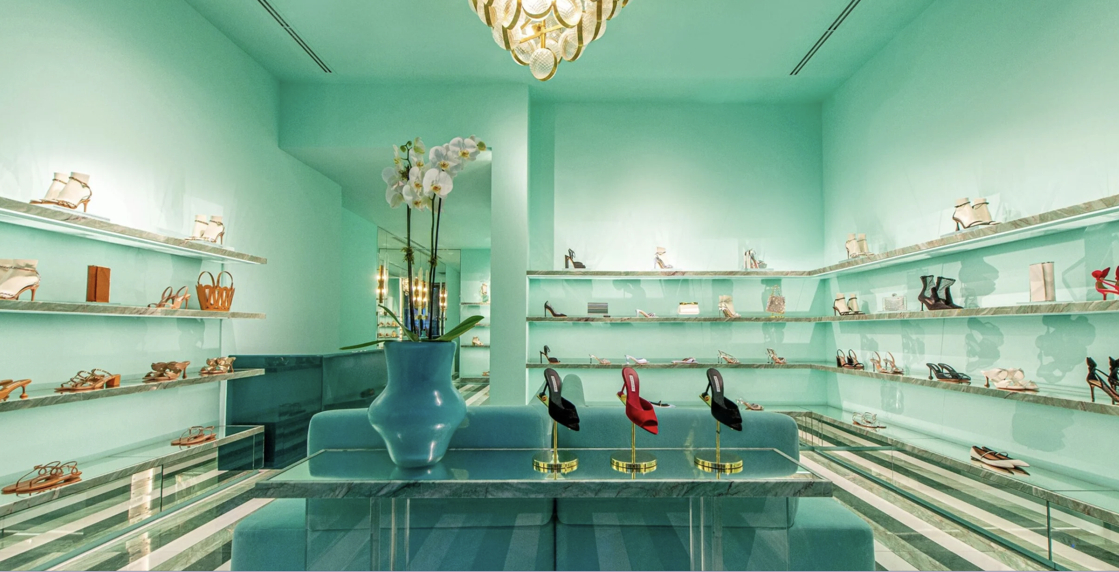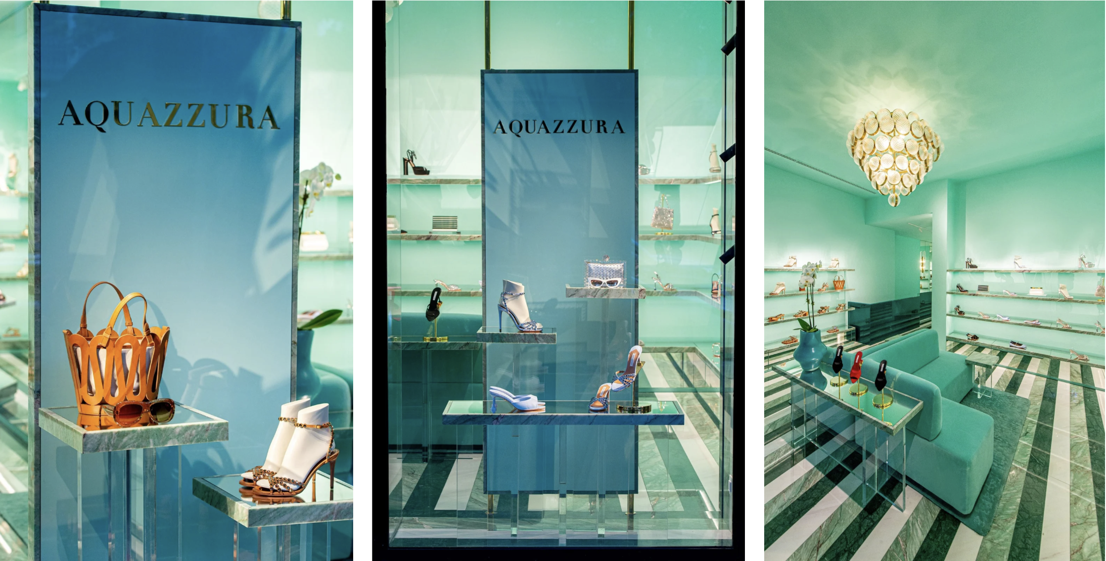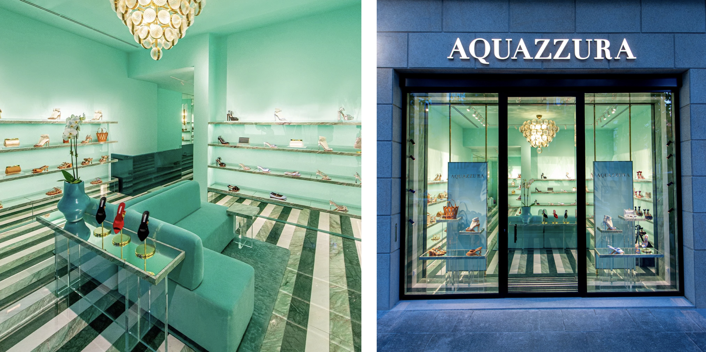 Im exklusiven Madrider Stadtteil Serrano, einem der bedeutendsten Luxus-Quartiere Spaniens, präsentiert sich die Aquazzura-Boutique als ein ikonischer Raum, der Eleganz, Materialkultur und markenprägende Identität auf eindrucksvolle Weise vereint. Das Gestaltungskonzept basiert auf einer intensiven, zugleich sanften Farbwelt aus Türkis- und Aquatönen, die die Boutique in eine luxuriöse, beinahe schwebende Atmosphäre taucht. Die Architektur verschmilzt mit dem Produkt, um ein harmonisches, vollständig immersives Markenerlebnis zu schaffen. Die Innenräume sind von klarer Geometrie und hochwertigen Materialien geprägt: glänzende Marmoroberflächen, transluzente Glasvitrinen, polierte Messingdetails und textile Akzente verbinden sich zu einem fein abgestimmten visuellen Rhythmus. Der gestreifte Marmorboden – ein zentrales Element der Rauminszenierung – leitet den Besucher wie ein grafisches Band durch den Raum und verstärkt den Eindruck architektonischer Tiefenwirkung. Die Präsentation der Produkte erfolgt auf schwebenden Elementen, die dank ihrer reduzierten Struktur den Fokus klar auf die Kollektionen lenken. Jede Ebene wurde so gestaltet, dass sie Leichtigkeit transportiert und gleichzeitig die Exklusivität der Marke betont. Die präzise abgestimmte Beleuchtung, subtil in die Architektur integriert, inszeniert die Schuhe wie kostbare Schmuckstücke. Ein besonderes Highlight ist der kristalline Kronleuchter, der als zentrales Objekt die Boutique mit einem warmen, goldenen Glanz erfüllt und einen eleganten Kontrast zur kühlen Farbpalette bildet. Dieses Zusammenspiel aus Licht und Materialität schafft eine Atmosphäre, die gleichermaßen modern, sinnlich und sorgfältig kuratiert wirkt. Das Projekt wurde in enger Partnerschaft mit Fipro España und Casa do Passadiço (Lissabon) realisiert, deren Expertise in Ausführung, Materialverarbeitung und Detailentwicklung wesentlich zum außergewöhnlichen Ergebnis beigetragen hat.