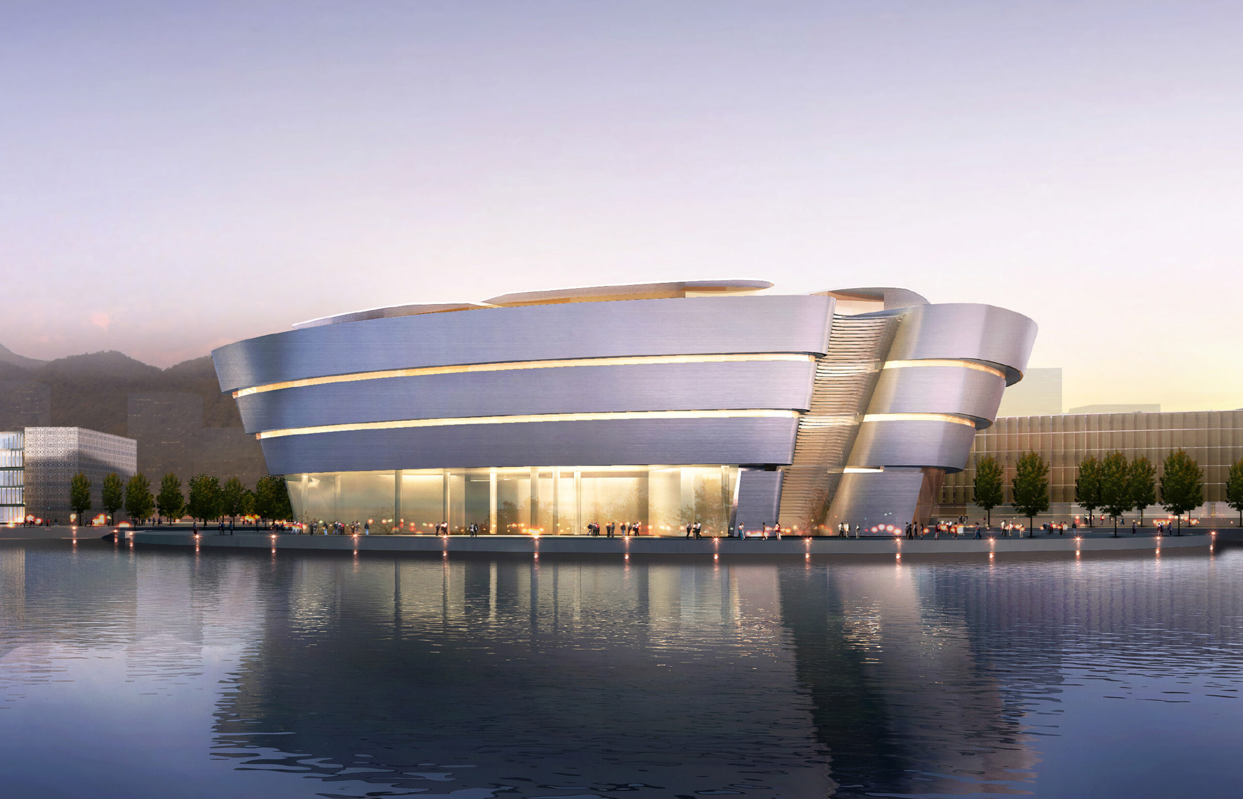 Das Projekt entsteht als präzise ausbalancierter Dialog zwischen zeitgenössischer Architektur und landschaftlichem Kontext und entwickelt sich zu einer identitätsstiftenden kulturellen Destination am Wasser. Die fließende, skulpturale Formensprache interpretiert organische und geometrische Prinzipien neu und verleiht dem Baukörper eine starke visuelle Präsenz, ohne dabei die Beziehung zum Ort zu verlieren.