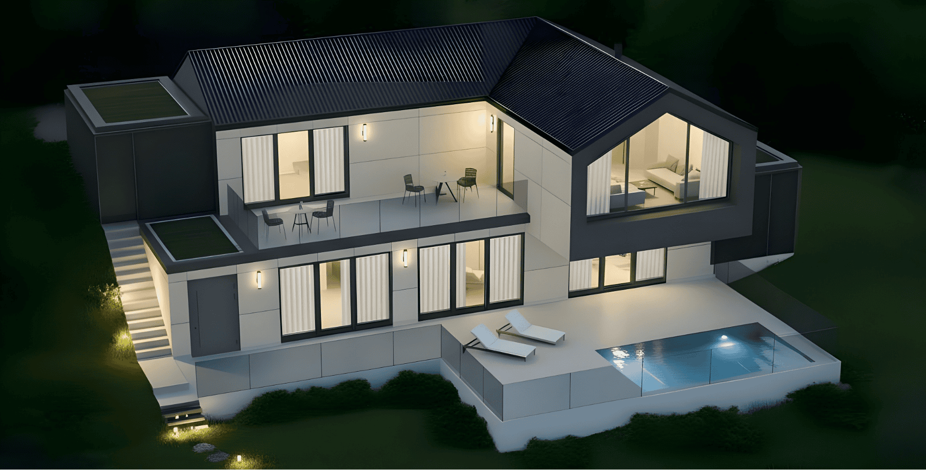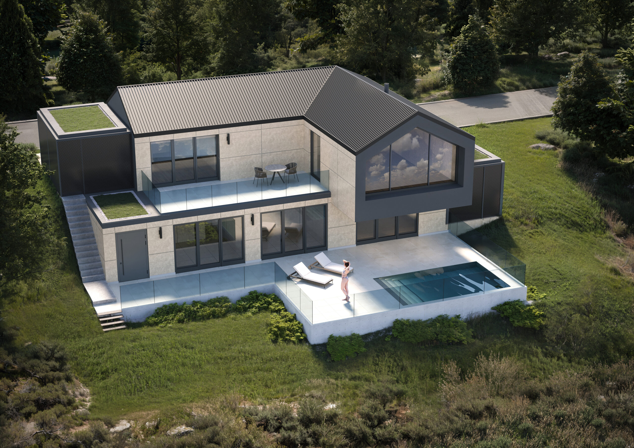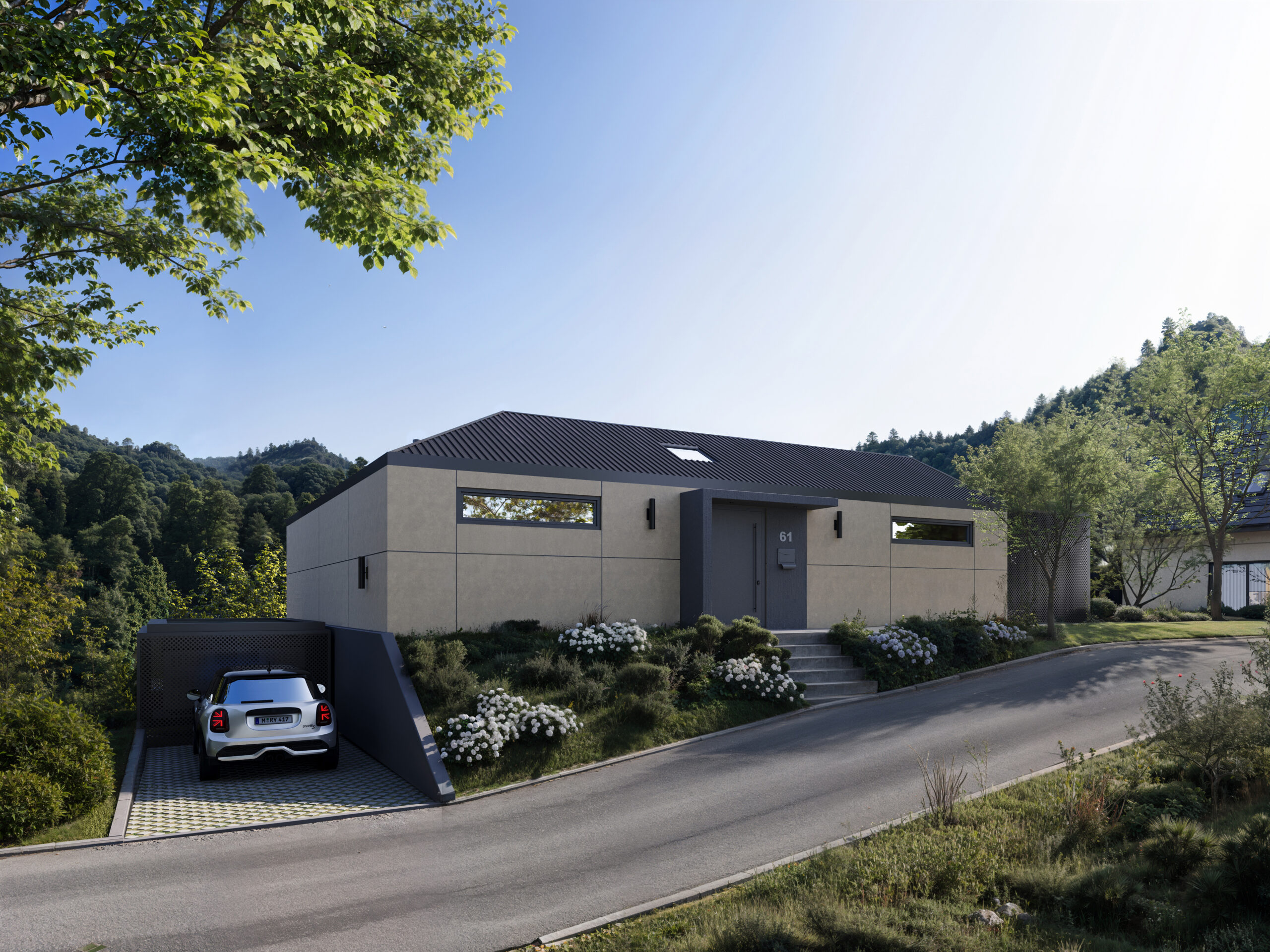 Am steilen Hang des Bergwegs, mit direktem Blick über das prächtige Rheintal, erhebt sich Bergweg 61 als ein Wohnhaus, das in besonderer Weise auf den Kontext reagiert. Das Projekt interpretiert die Topografie nicht als Herausforderung, sondern als Ressource – als räumlichen und atmosphärischen Mehrwert. Durch die exakte Setzung des Baukörpers, sein leichtes Vorspringen und seine geschützten Einschnitte entsteht ein Gebäude, das sich zugleich fest mit dem Boden verzahnt und dennoch leicht über der Landschaft zu schweben scheint. Die Architektur ist bewusst klar, reduziert und ausdrucksstark gehalten. Sichtbeton, als primäres Gestaltungselement eingesetzt, vermittelt Solidität und Dauerhaftigkeit. Seine rohe, ehrliche Oberfläche bildet einen spannenden Kontrast zu den großzügigen Glasfronten, die – wie präzise geschnittene Öffnungen – den Blick ungehindert in die Ferne lenken. Die dunklen Metallpaneele entlang der Dachflächen und Balkone modellieren das Volumen weiter und verleihen ihm eine grafische Eleganz, die das Gebäude sowohl bei Tageslicht als auch bei Abendbeleuchtung markant erscheinen lässt. Im Inneren setzt sich diese architektonische Haltung fort. Die Räume sind so konzipiert, dass sie den Verlauf des Geländes subtil aufnehmen und sich in einer fließenden Raumsequenz entfalten. Die zentrale Treppenhalle bildet das vertikale und visuelle Rückgrat des Hauses: ein transparenter Raum, der durch seine große Verglasung selbst zu einem architektonischen Element wird, das das Leben im Haus nach außen sichtbar macht. Licht dringt kontrolliert tief in das Gebäude ein, reflektiert von hellen Oberflächen und schafft zu jeder Tageszeit eine stille, ausgewogene Atmosphäre. Die Materialität ist sorgfältig orchestriert: Der rohe Beton wird durch warme, haptische Materialien ergänzt, die Wohnlichkeit und Raffinesse vermitteln. Holz, weiche Textilien, matte Metalltöne und ausdrucksstarke Bodenbeläge bilden eine harmonische Palette, die mit der Strenge der Außenhülle kontrastiert. Diese Balance zwischen Robustheit und Komfort prägt das gesamte Raumgefühl. Das Projekt legt großen Wert auf energetische Effizienz, gut dimensionierte Öffnungen und eine thermisch optimierte Gebäudehülle. Gleichzeitig wird die Aussicht, als zentrales Thema des Entwurfs, immer wieder inszeniert: vom Wohnbereich aus, der sich weit zur Landschaft hin öffnet, bis zu kleinen, unerwarteten Blickachsen, die das Panorama in den Alltag integrieren. Bergweg 61 ist ein Haus, das mehr ist als seine Kubatur. Es ist eine architektonische Erzählung, die von Ruhe, Klarheit und Landschaft handelt. Ein Gebäude, das seine Umgebung wertschätzt, sie rahmt und gleichzeitig eine starke eigene Identität besitzt.